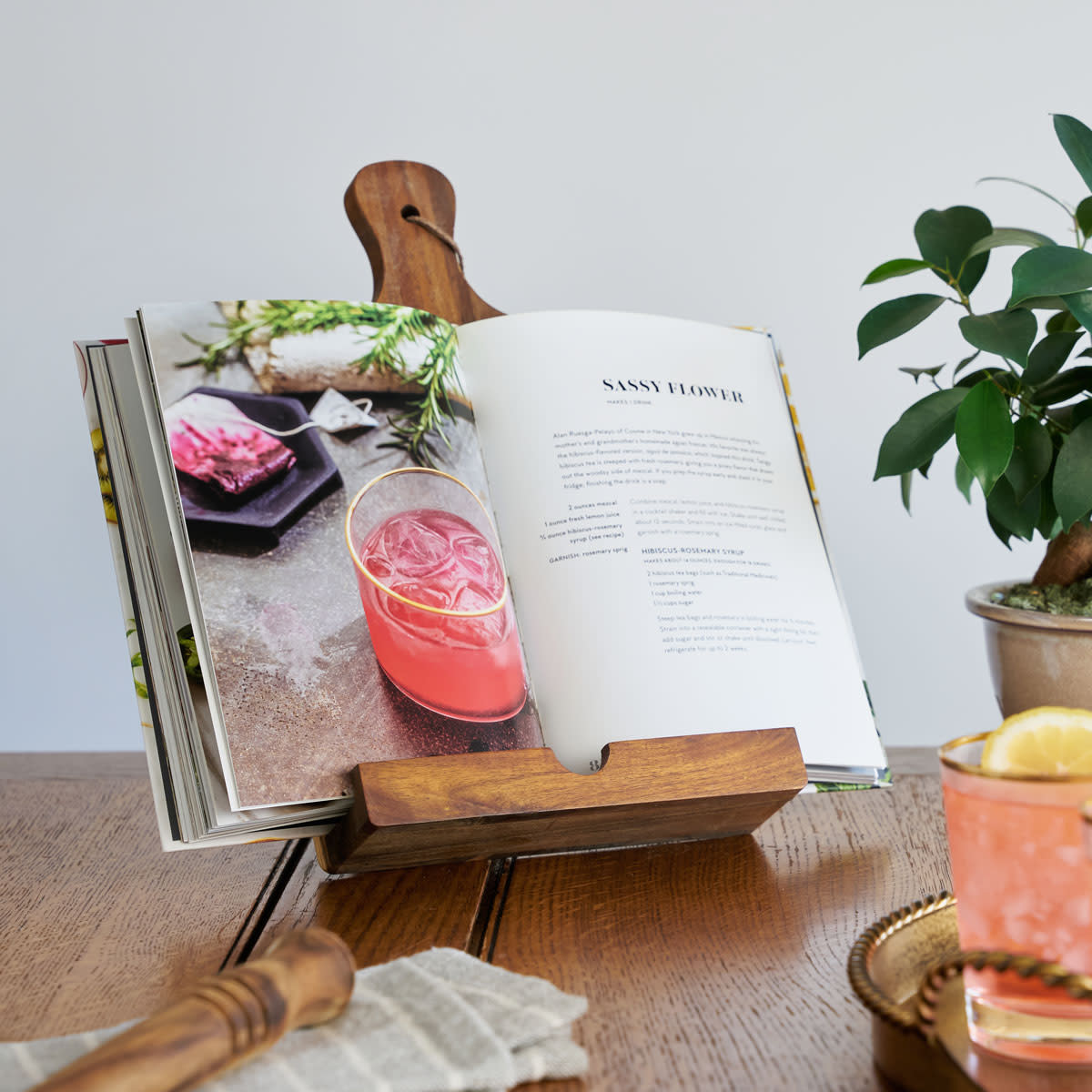This smooth-sanded acacia wood cooking easel holds a tablet, smartphone, cookbook, or recipe card so you can glance back at the ingredients and instructions as many times as you wish. With elegantly rounded corners, a hinged brace at its back, and a faux leather strap for hanging when not in use, you'll never cover your phone or tablet in flour or sugar again!