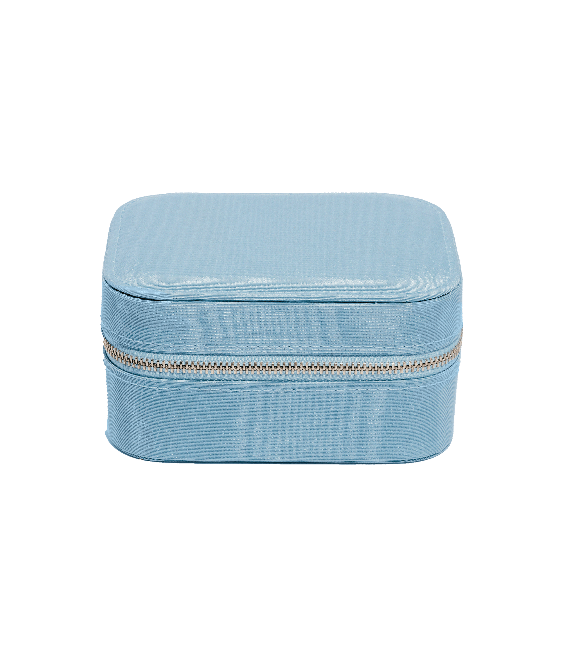 Material: Moiré fabric exterior, silk velvet interior, 24k shiny gold finish over brass zipper.