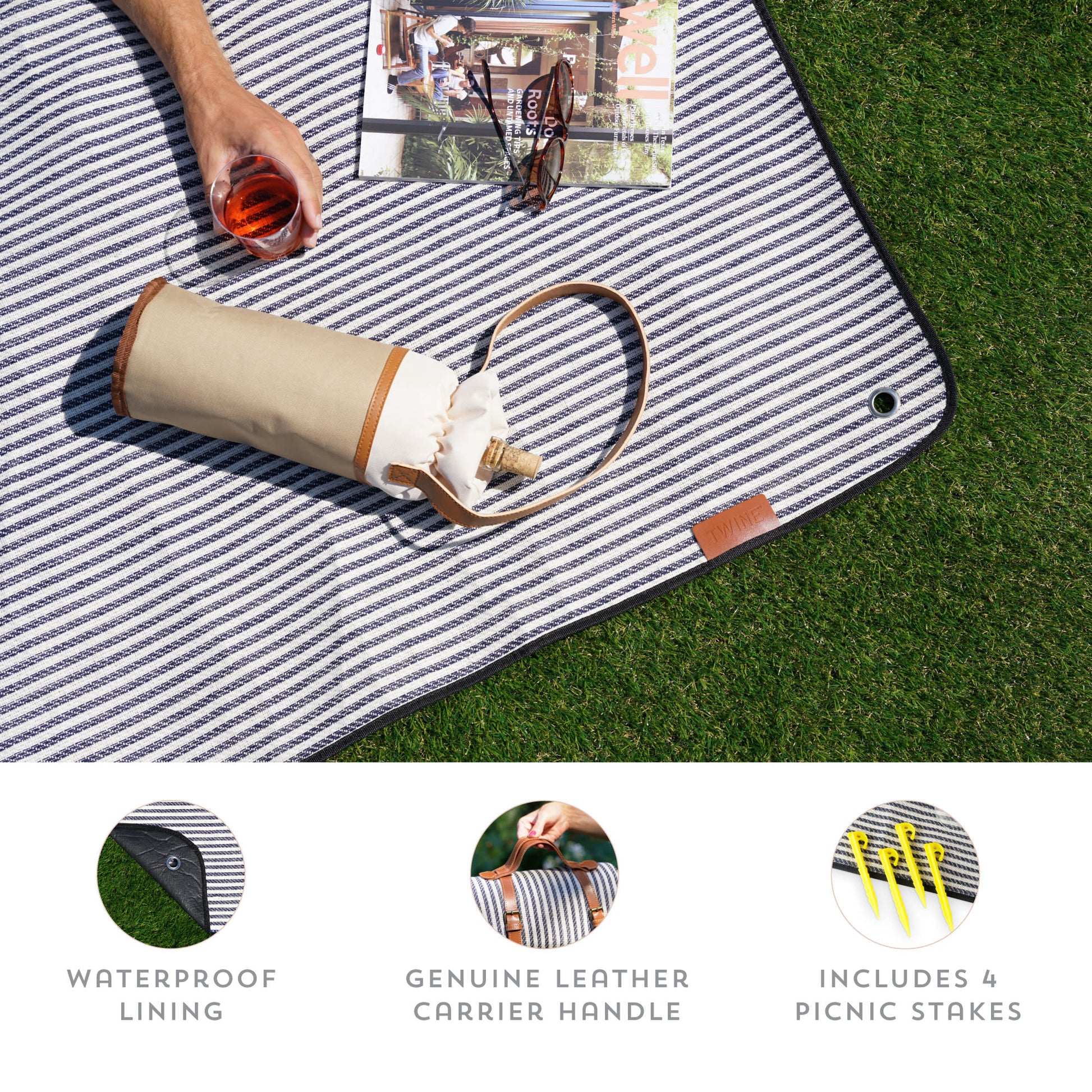 With its nautical pinstripes and waterproof lining, this blanket calls for a romantic picnic under a shady tree or a sunny lunch at the beach. A genuine leather carrier and four picnic stakes are conveniently included for a carefree outdoor date.